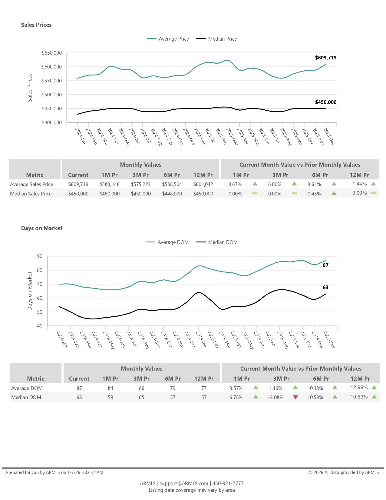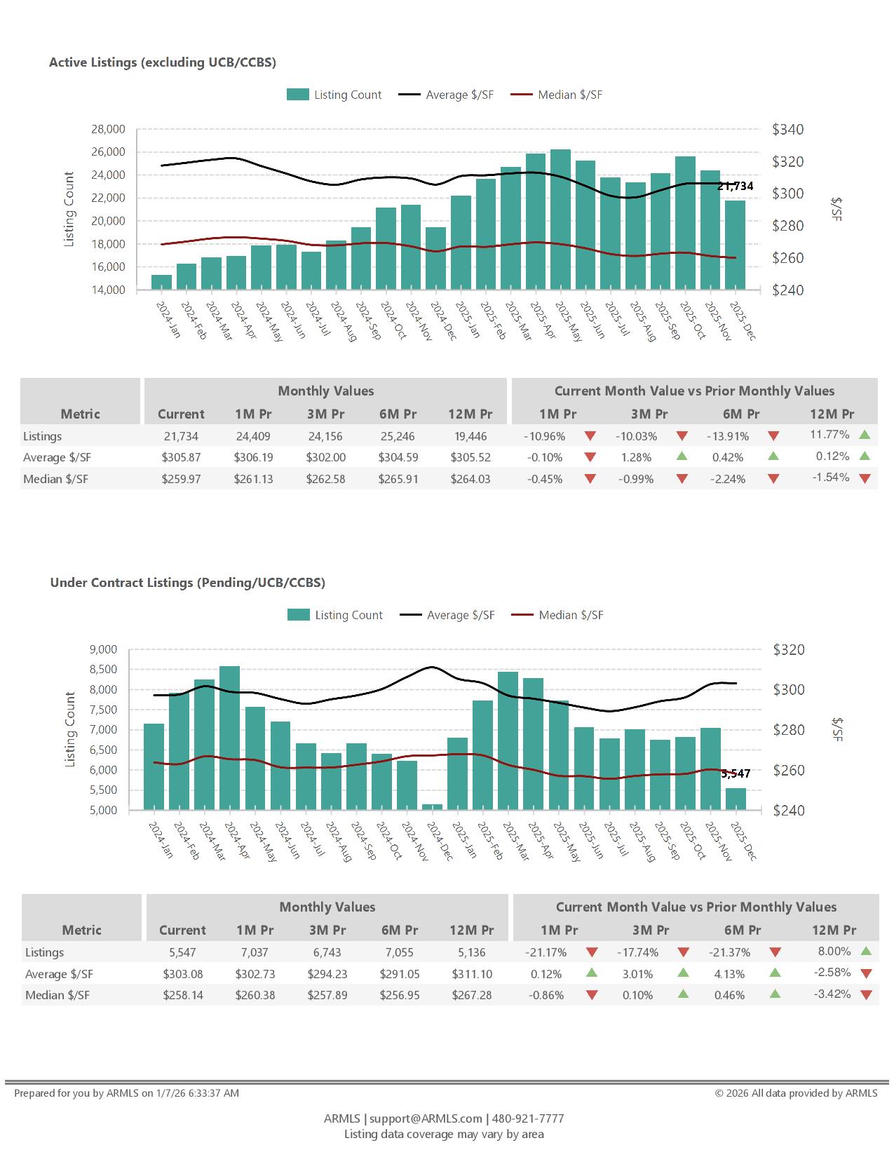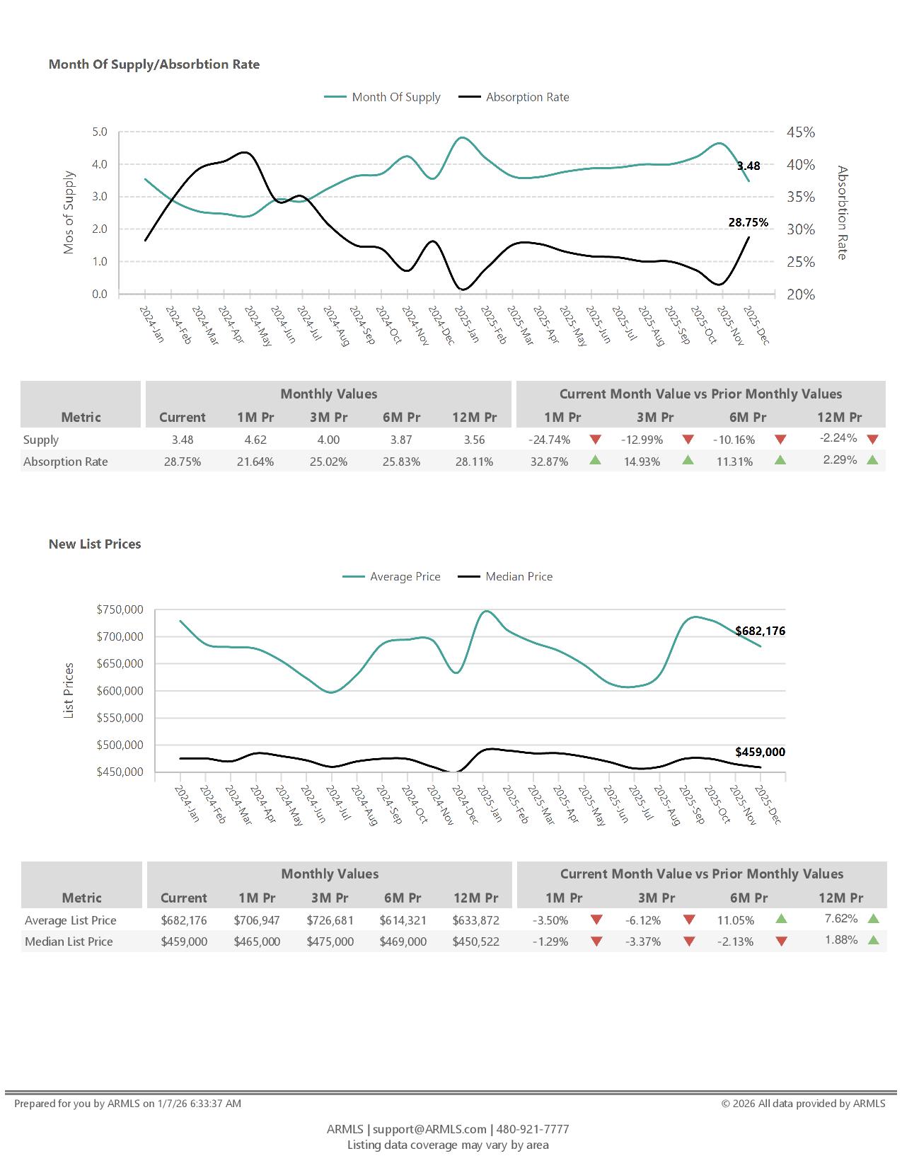 The December 2025 ARMLS data indicate that the Greater Phoenix housing market is closing out the year in a more balanced and deliberate position. The average sales price rose to $609,719, while the median sales price held steady at $450,000, reinforcing price stability rather than volatility. Homes are taking longer to sell, with an average of 87 days on market and a median of 63 days, indicating that buyers are more selective and sellers must price their properties strategically. Inventory tightened slightly, with active listings at 21,734, while months of supply decreased to 3.48, and the absorption rate climbed to 28.75%, indicating improved buyer activity compared to prior months. New listing prices softened modestly, suggesting sellers are adjusting expectations to meet market conditions. Overall, December’s numbers reflect a market driven by fundamentals — not urgency — where preparation, pricing, and patience are key for success heading into 2026.