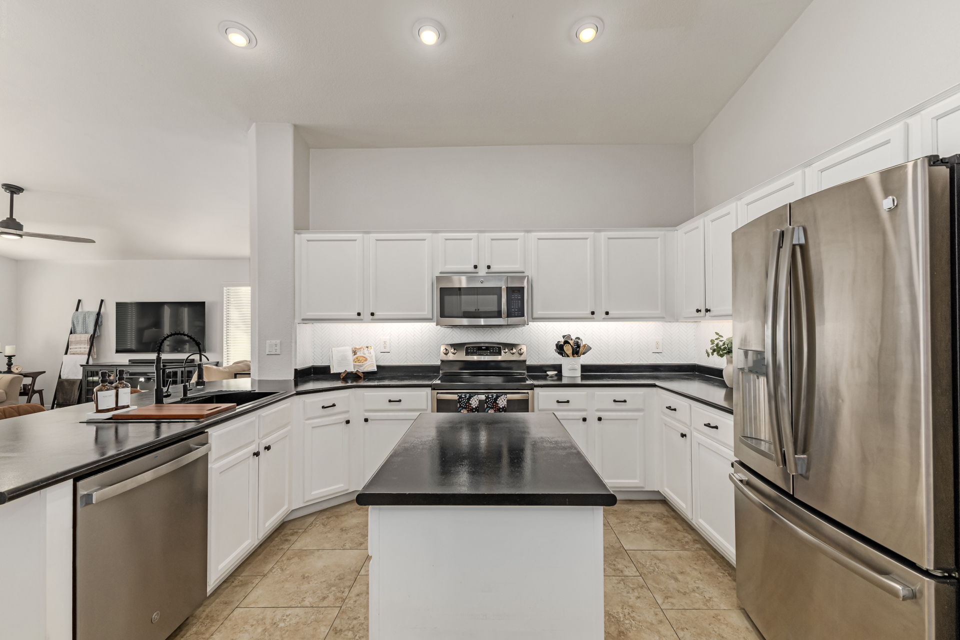 The kitchen is perfect for gathering, featuring stainless steel appliances, an island, and abundant storage.