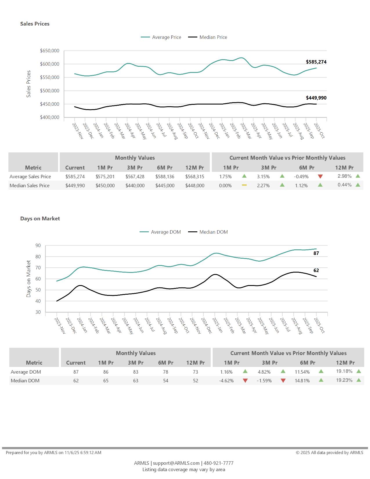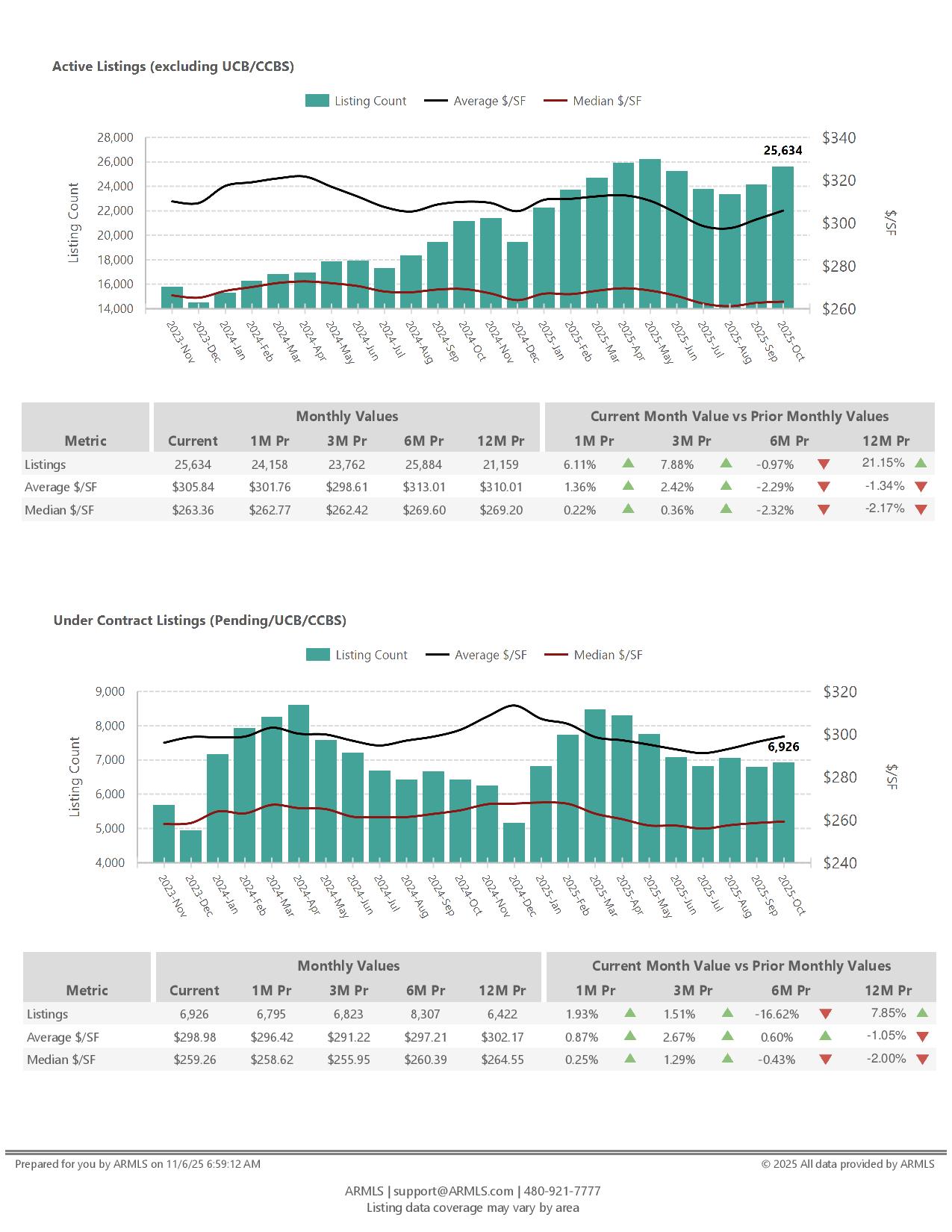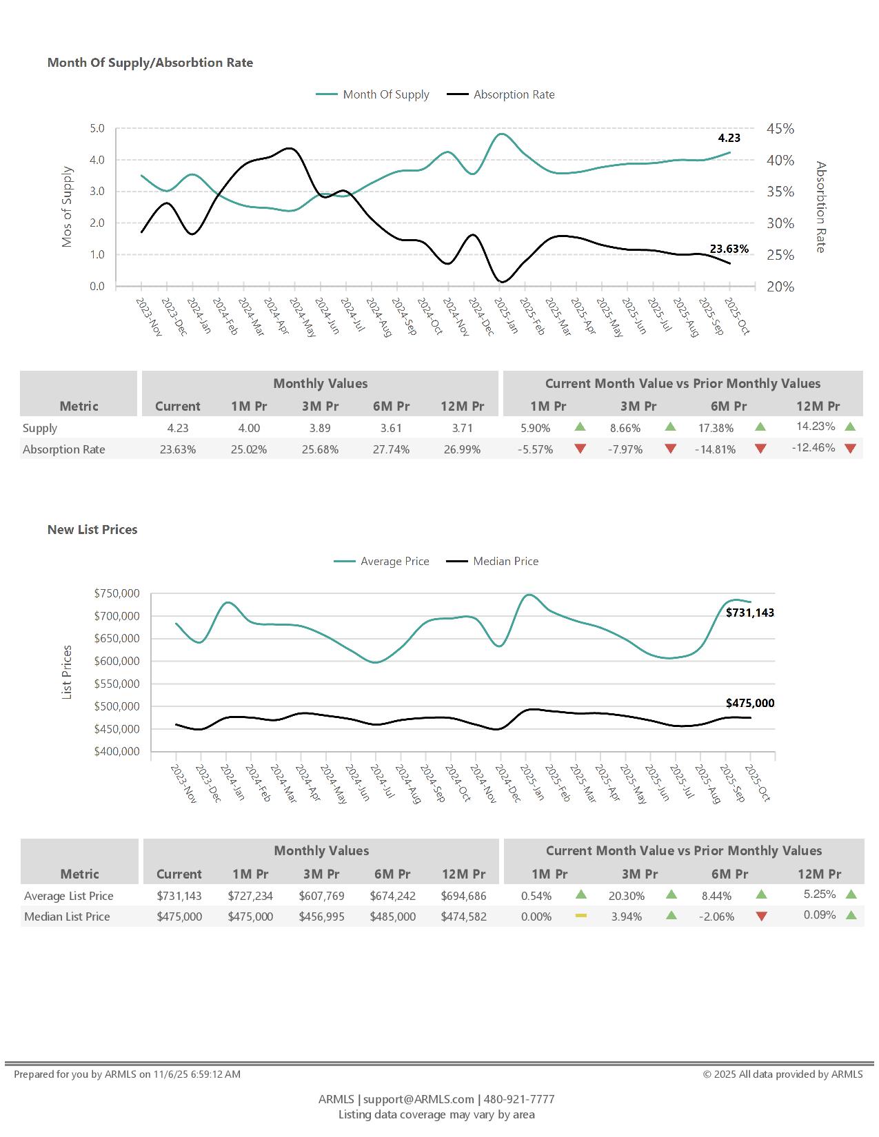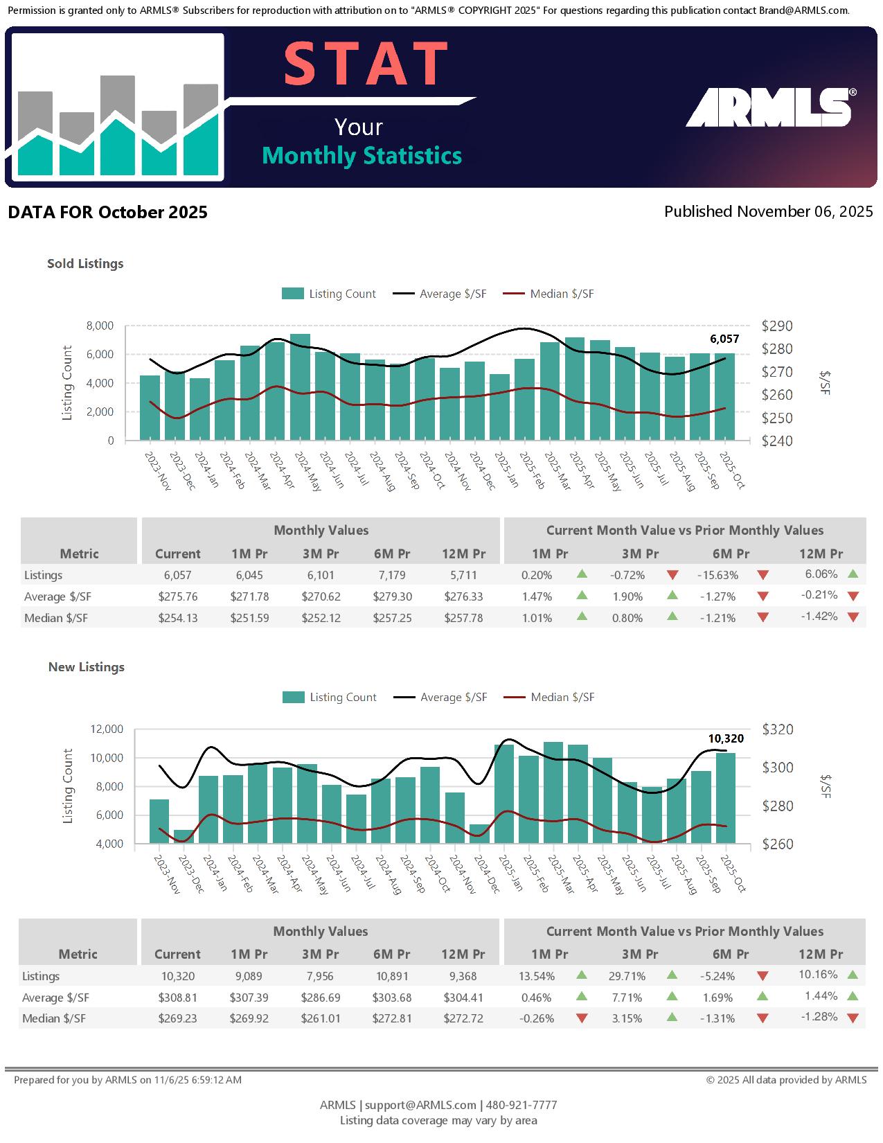The October 2025 ARMLS STAT Report shows a market that’s shifting steadily toward balance across Greater Phoenix. Inventory continues to rise year-over-year, giving buyers more selection than they’ve had in several seasons, while prices are holding relatively stable with only mild month-to-month adjustments. Days on market remain elevated compared to last year, which signals that homes are no longer flying off the shelf and sellers need to price strategically from day one. At the same time, absorption rates and supply levels point to a market that’s cooling but not collapsing — more like a return to normalcy after several years of extremes. Whether you’re buying or selling, understanding these trends helps you make smarter moves in today’s Arizona real estate landscape.