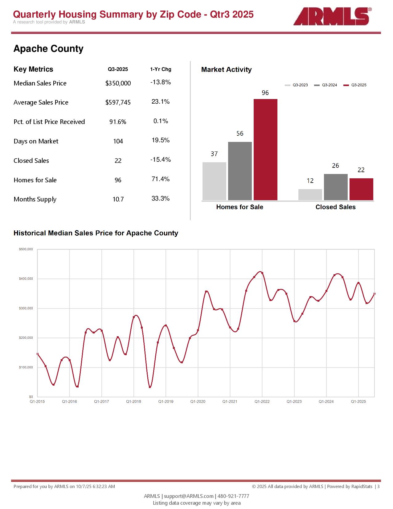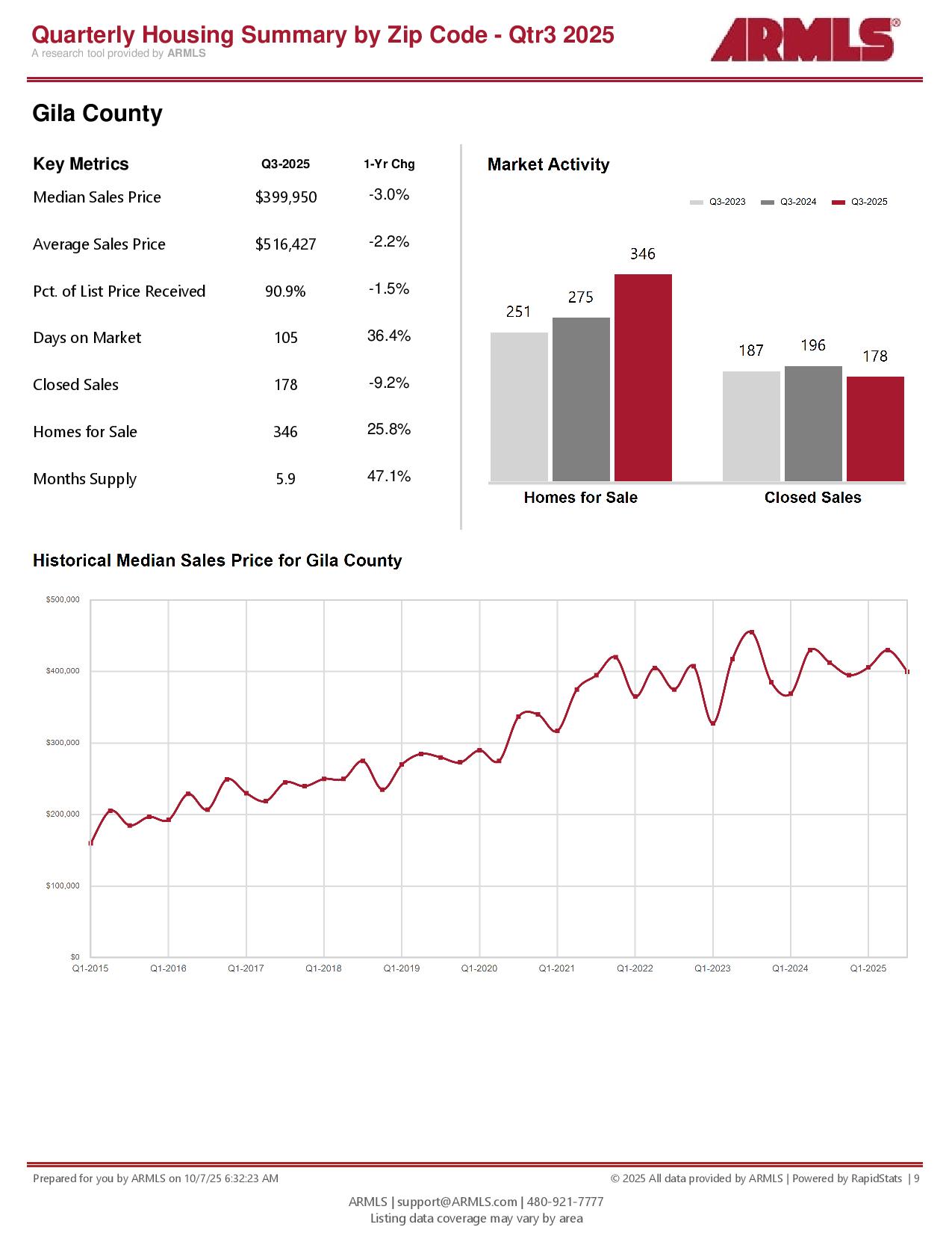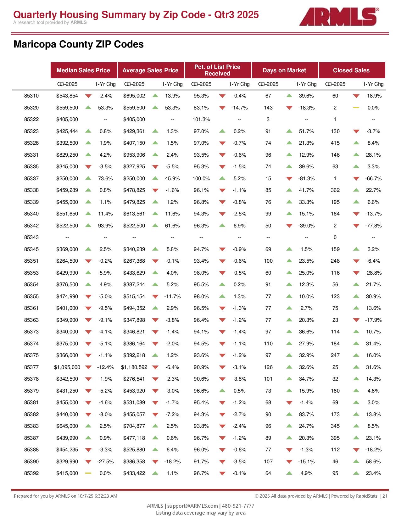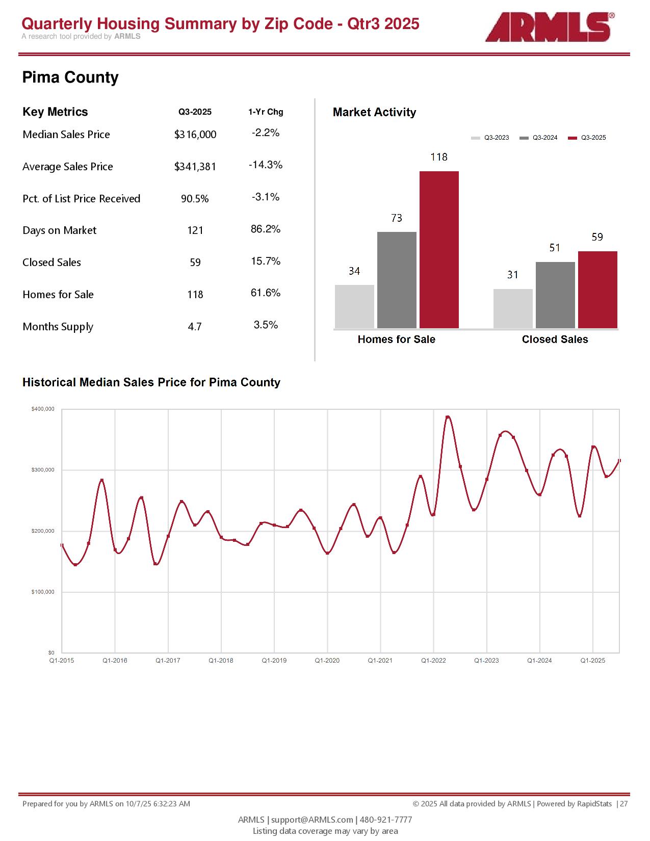 The Q3 2025 ARMLS Housing Summary shows Arizona’s real estate market reaching a steady equilibrium. Median home prices held mostly flat statewide, with Maricopa County leading the trend at a $469,000 median and $601,426 average — both nearly unchanged from last year. Closed sales rose 6.1% while listings climbed 20%, bringing months of supply to 3.8 and signaling slower absorption. Average days on market increased to 84 in Maricopa, 87 in Pinal, and 121 in Pima, reflecting a more deliberate sales pace. Pinal’s median price edged up 1.4% to $369,995, while Pima dipped 2.2% to $316,000. Northern and rural counties like Coconino and Navajo posted stronger activity, though smaller areas such as Graham and La Paz saw wider price swings due to limited volume. Overall, Q3 data indicate a normalized, balanced market where buyers enjoy more options and sellers must focus on realistic pricing and presentation.