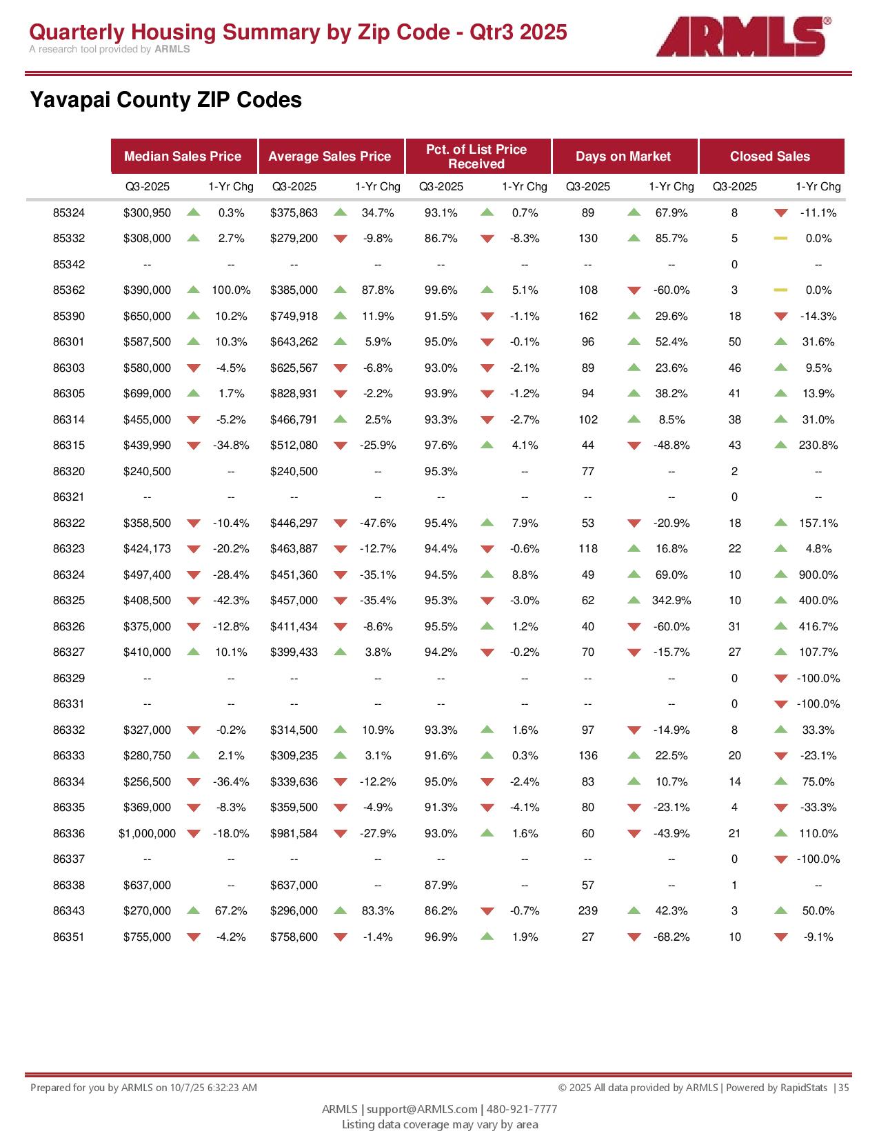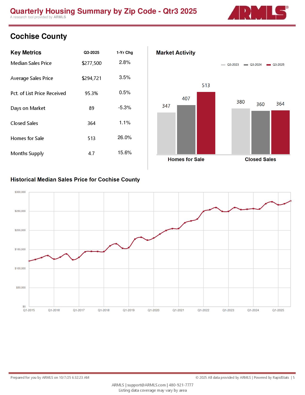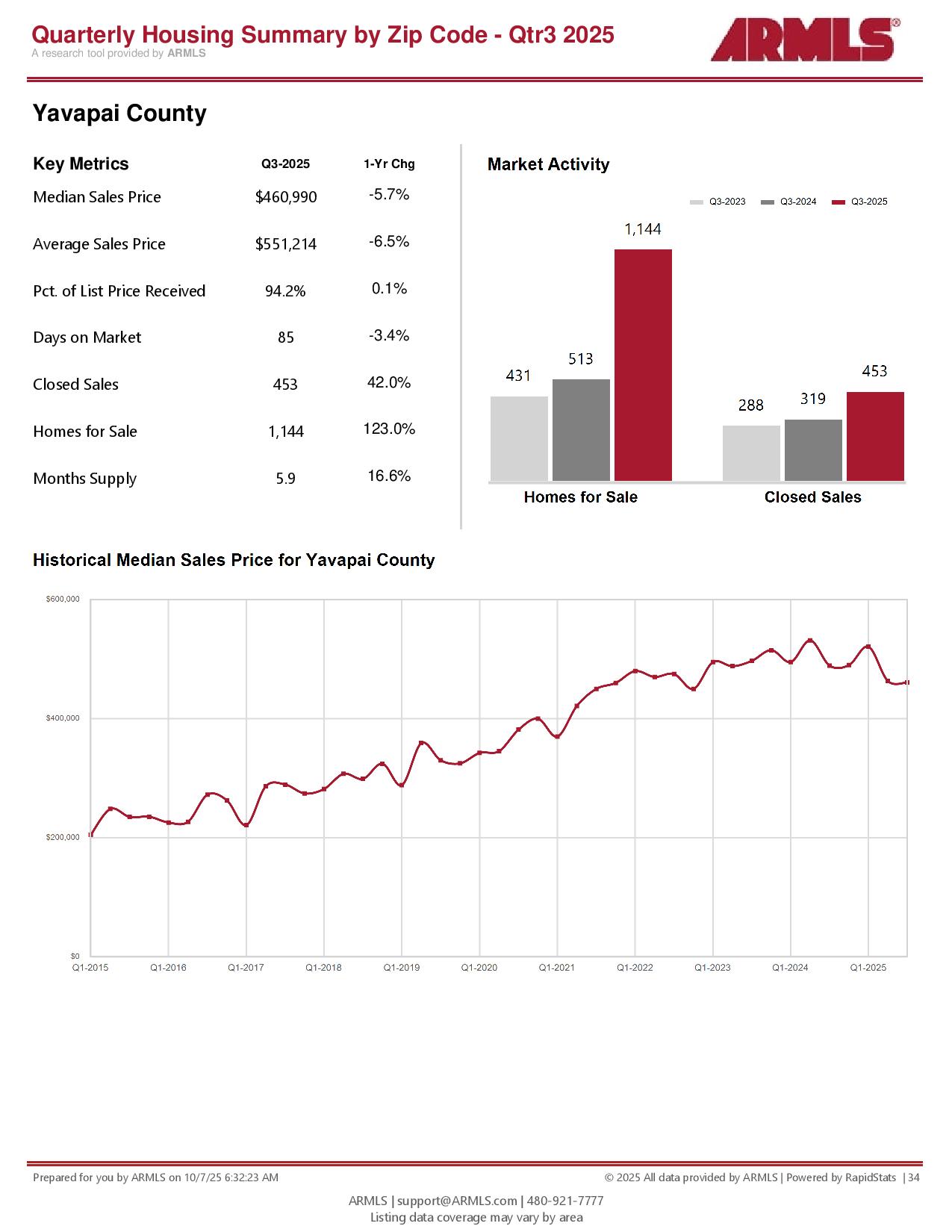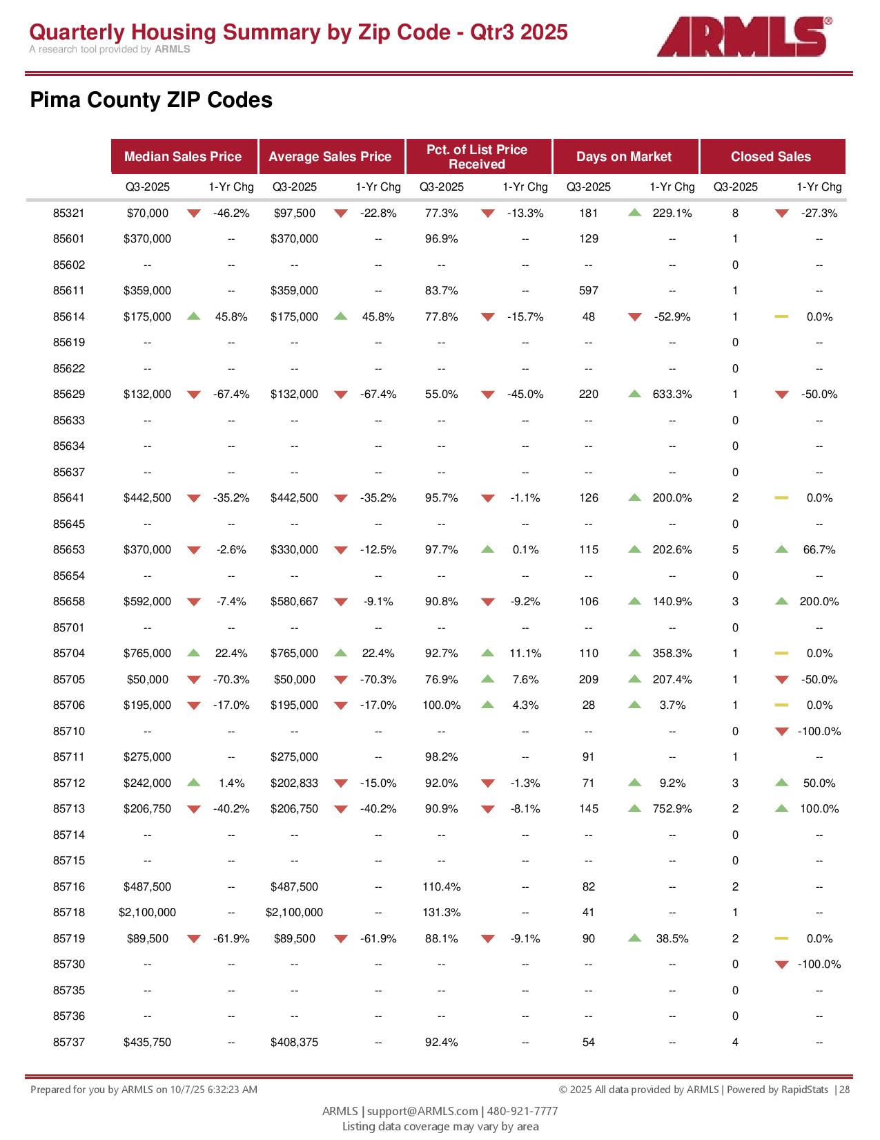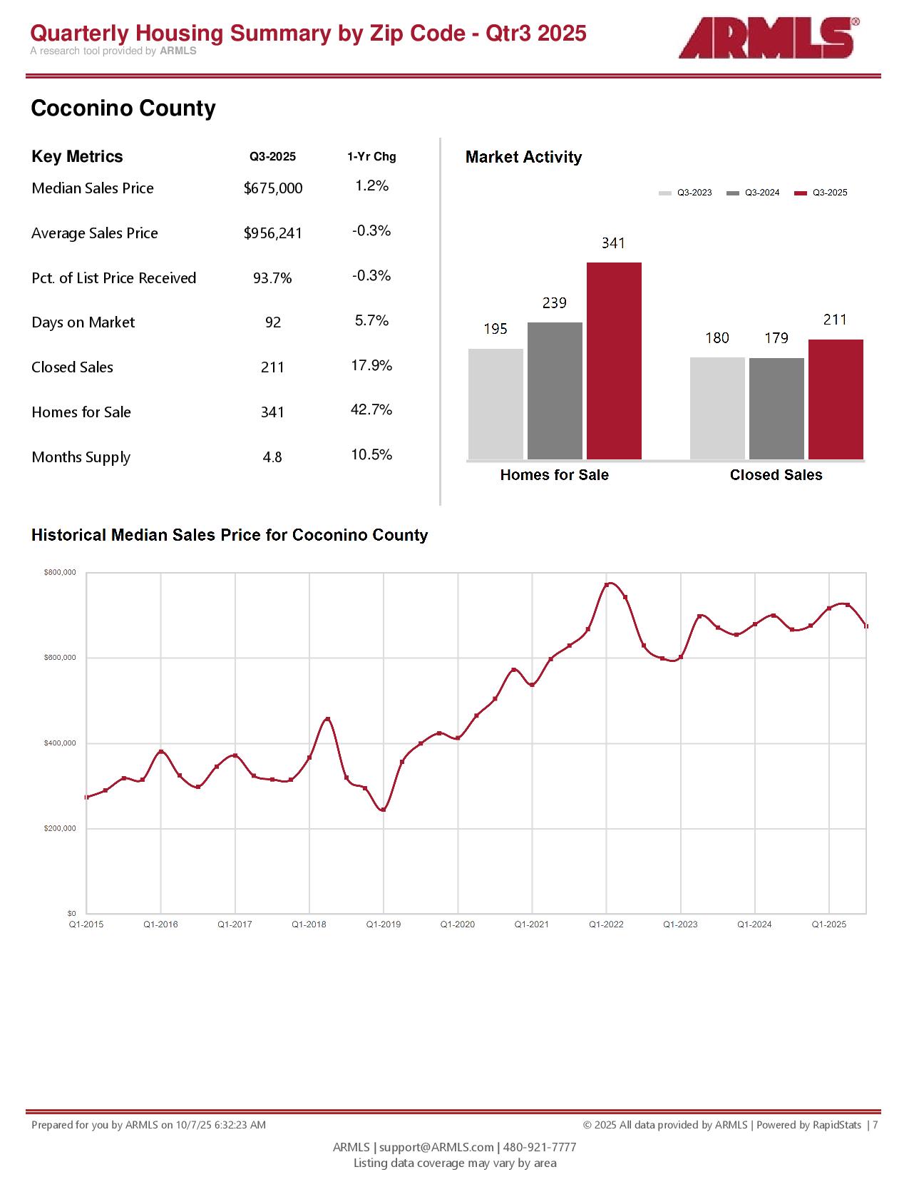 The Q3 2025 ARMLS Housing Summary shows Arizona’s real estate market reaching a steady equilibrium. Median home prices held mostly flat statewide, with Maricopa County leading the trend at a $469,000 median and $601,426 average — both nearly unchanged from last year. Closed sales rose 6.1% while listings climbed 20%, bringing months of supply to 3.8 and signaling slower absorption. Average days on market increased to 84 in Maricopa, 87 in Pinal, and 121 in Pima, reflecting a more deliberate sales pace. Pinal’s median price edged up 1.4% to $369,995, while Pima dipped 2.2% to $316,000. Northern and rural counties like Coconino and Navajo posted stronger activity, though smaller areas such as Graham and La Paz saw wider price swings due to limited volume. Overall, Q3 data indicate a normalized, balanced market where buyers enjoy more options and sellers must focus on realistic pricing and presentation.