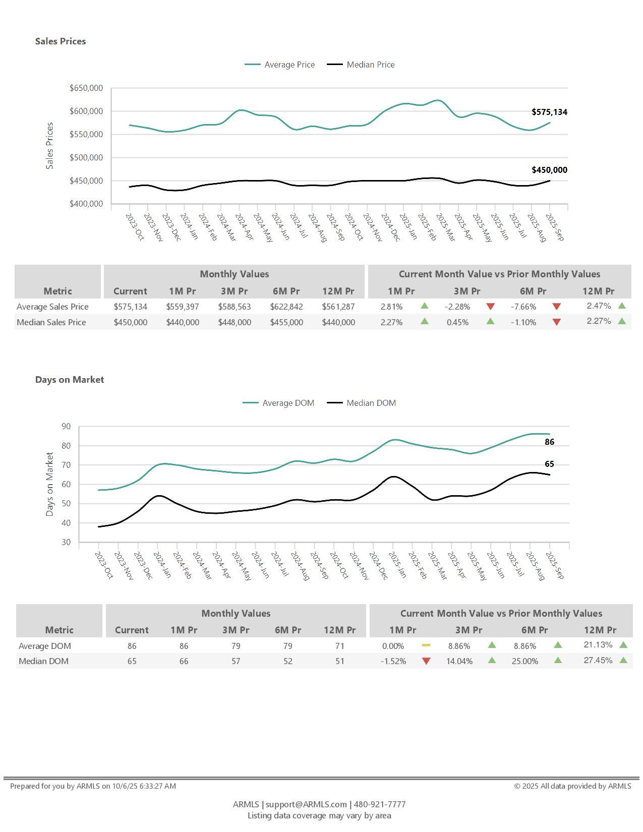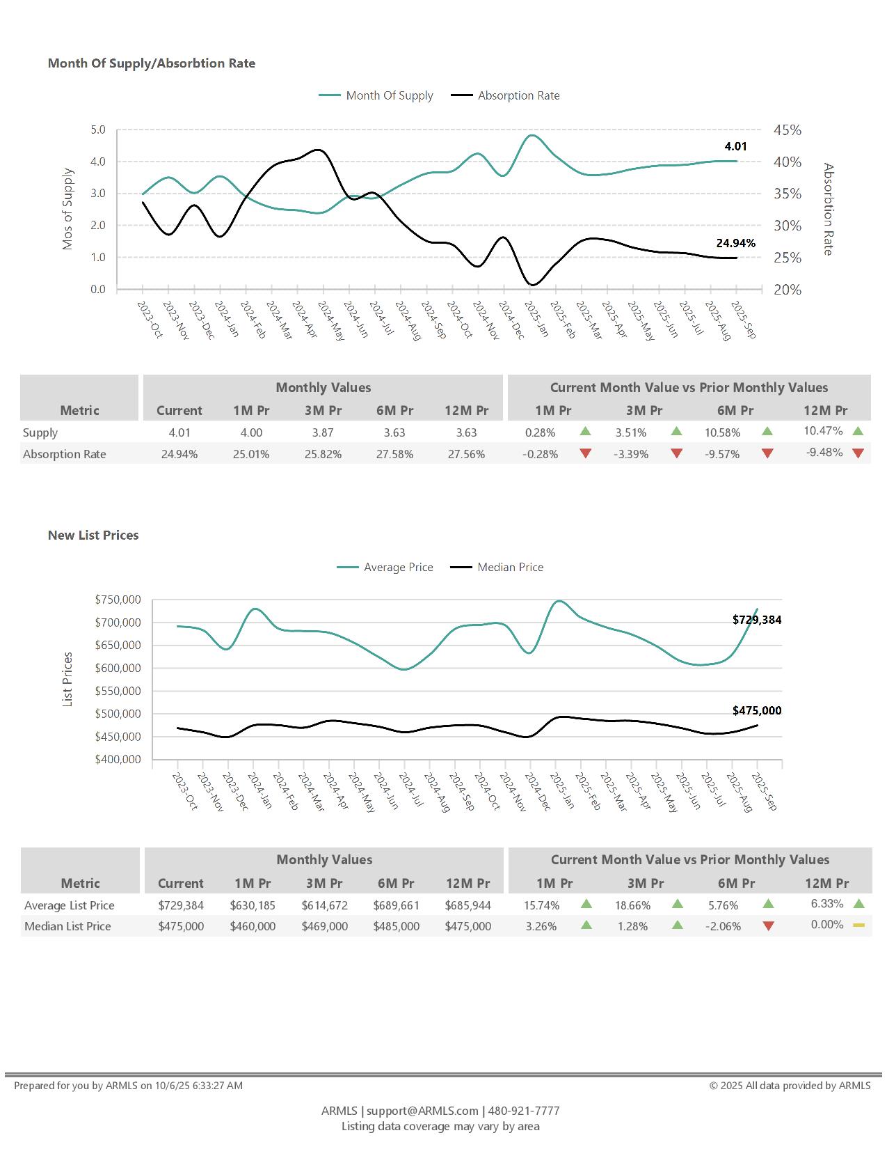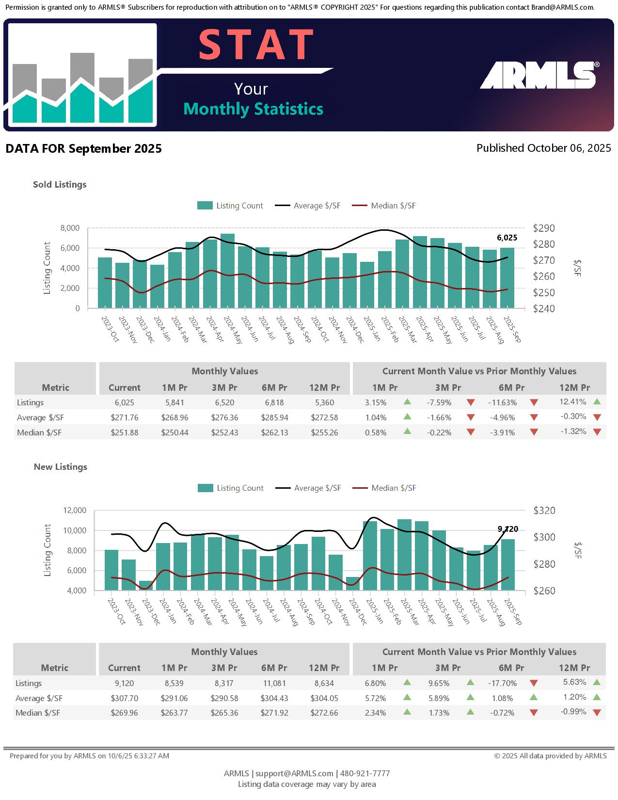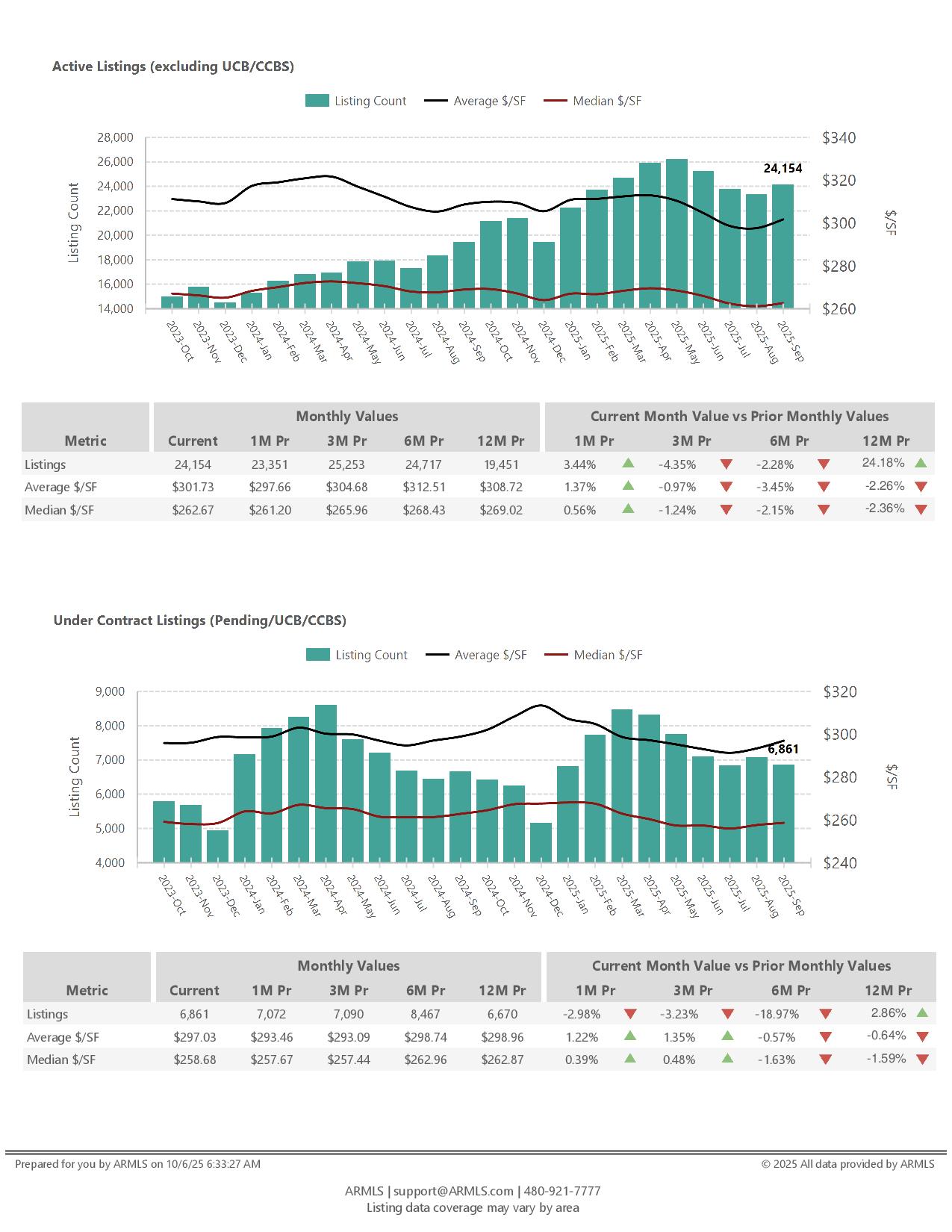 The September 2025 Housing Market Report reflects a steady but cooling Arizona market. Active listings rose 3.4% month-over-month to 24,154, marking a 24% increase from last year as inventory continues to build. The average price per square foot climbed slightly to $301.73, while the median rose to $262.67, both modest gains over August but down from six months ago. Average and median sales prices posted small monthly increases, reaching $575,134 and $450,000, respectively, yet remain below early 2025 peaks. Market pace softened, with average days on market holding at 86 and median days at 65, both up over 20% year-over-year. Supply stayed level at 4.01 months as the absorption rate eased to 24.9%, pointing to slower buyer activity. Overall, September’s data suggests a market in balance, more listings, steadier prices, and buyers taking a cautious, calculated approach heading into fall.